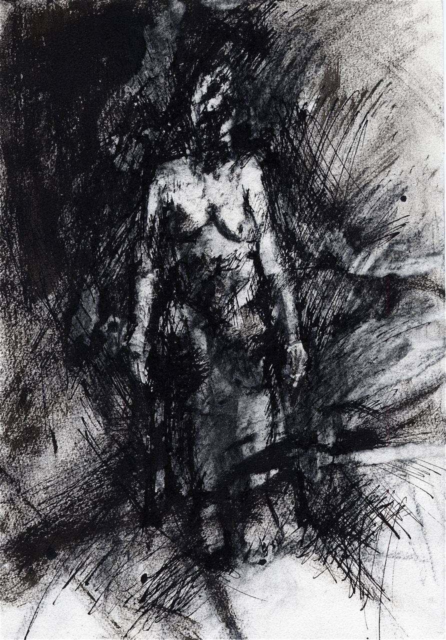 Figure in Space, ink and charcoal on paper, 12in x 8.5in