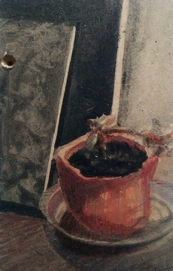 Wood blocks and cactus, ink and conte crayon on wood, 12 x 19cm