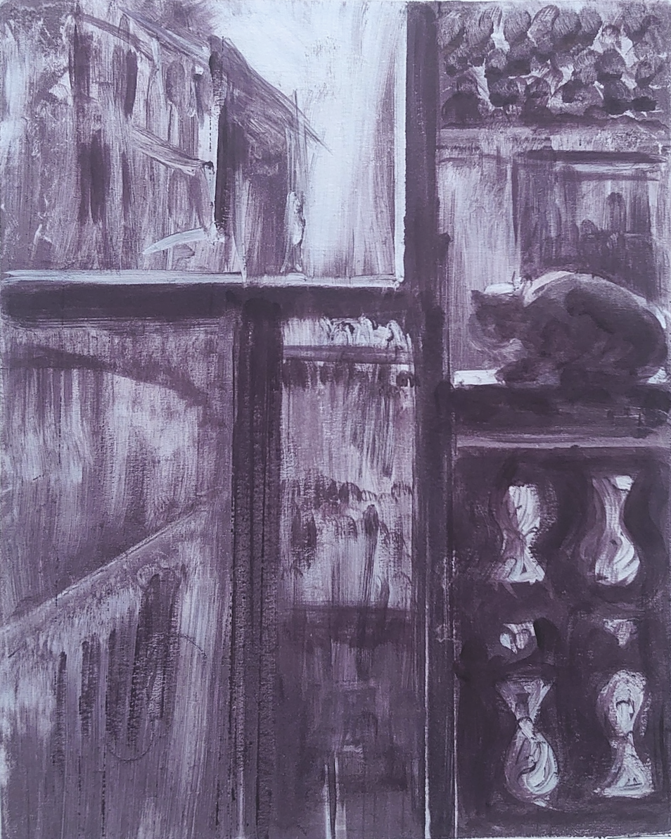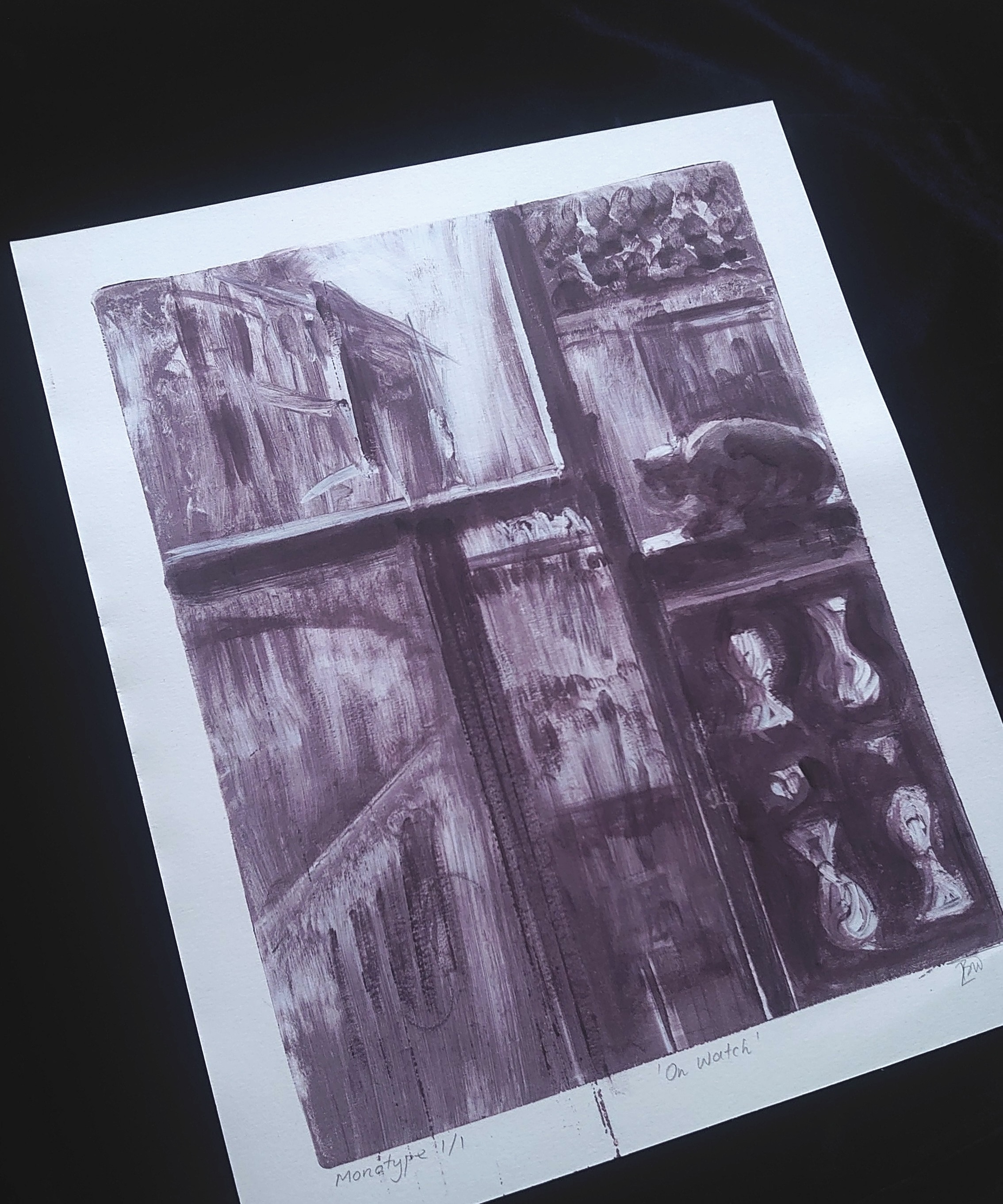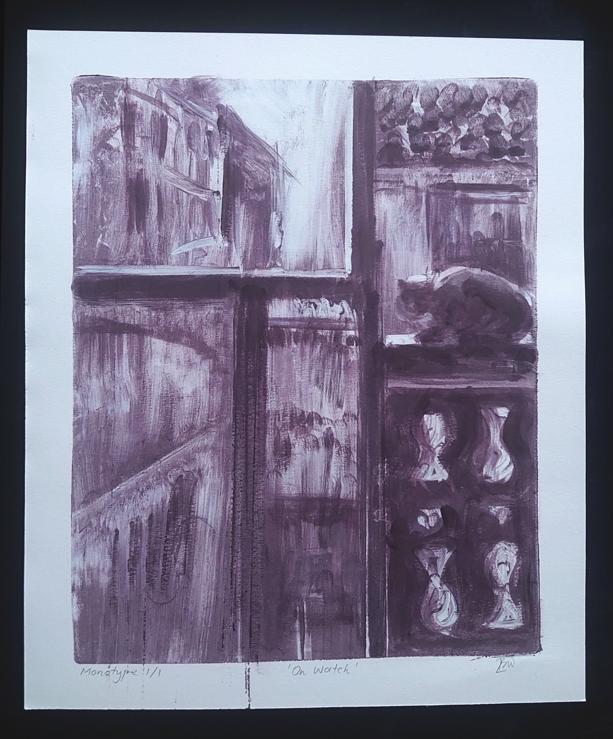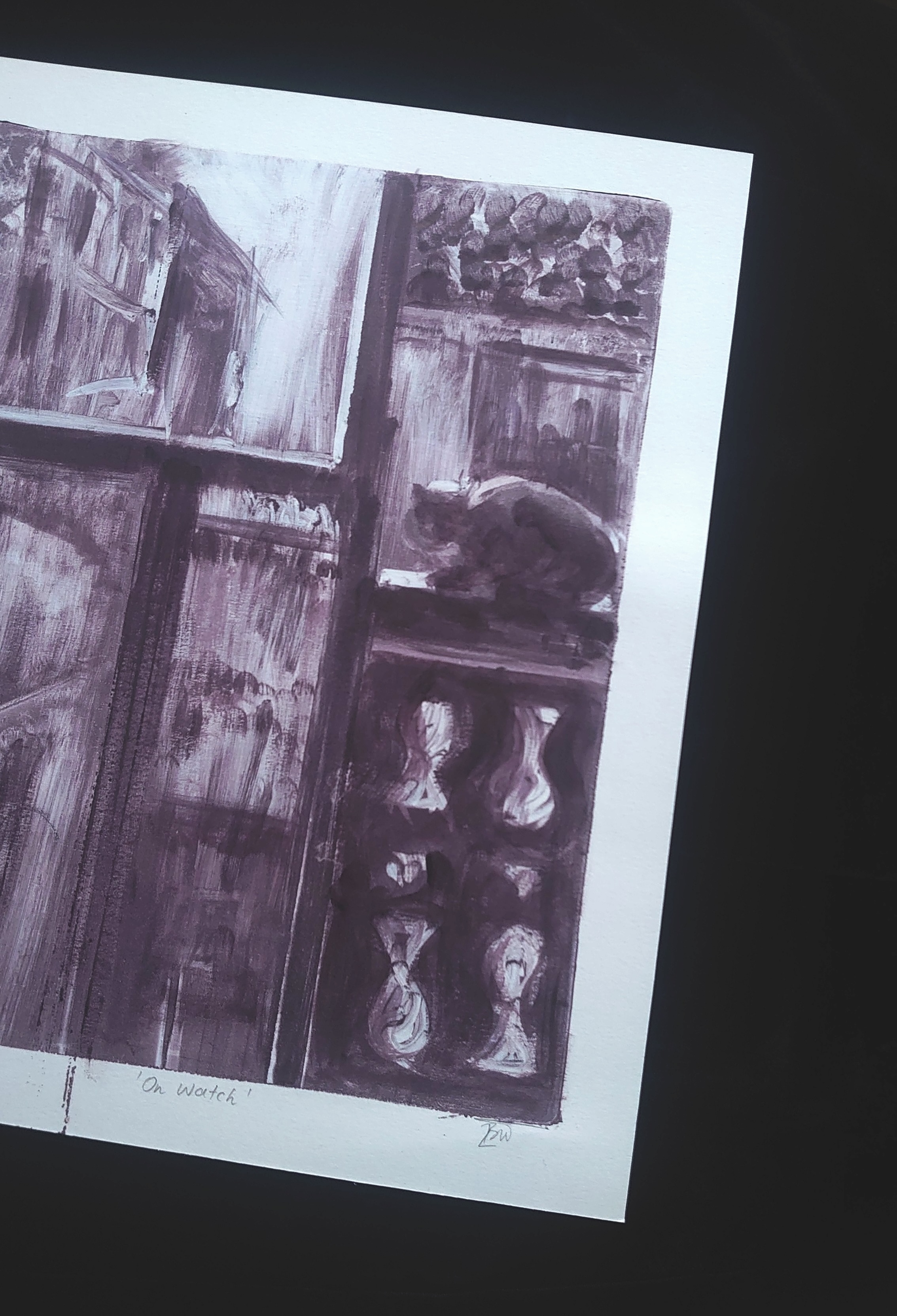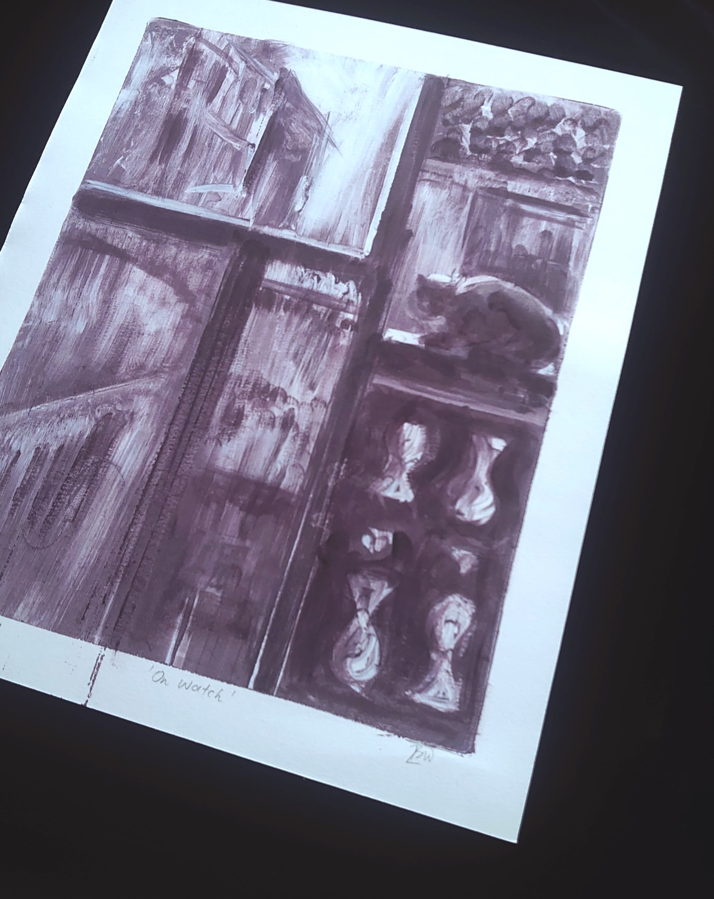 About the work: On Watch is part of a small series of works inspired by life in a Transylvanian village. In this scenario the cat is watching over the tranquil hamlet, immersed in the crisp late autumn light.